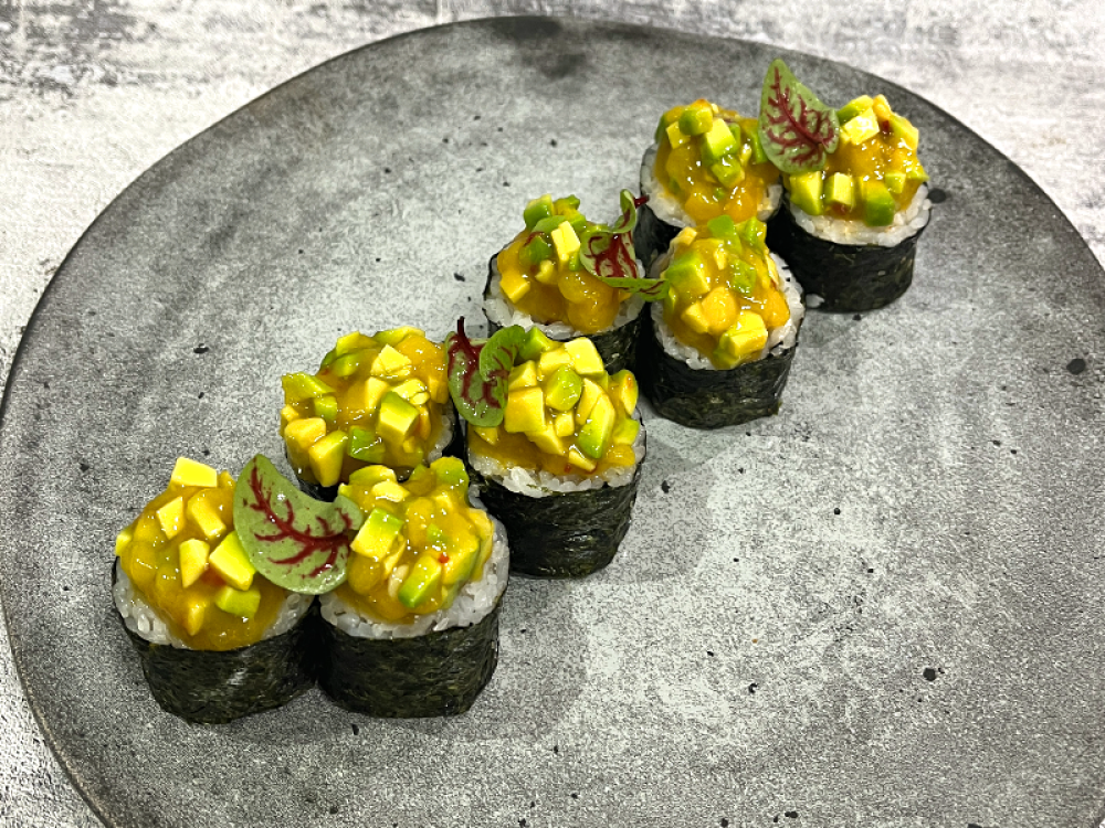 Если вы любите морепродукты и необычные сочетания вкусов, вам обязательно стоит попробовать этот ролл. В его состав входят креветки, авокадо, спайси-соус, соус манго-чили, рис и, конечно же, манго